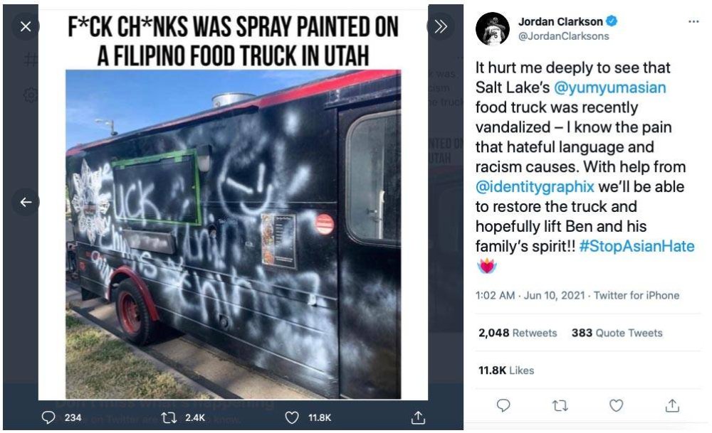 Foodbeast On Twitter Utah Jazz Star Jordanclarksons Helps Local Filipino Food Truck Yumyumasian After It Was Vandalized With Racist Graffiti Https T Co Btebuczmmq Twitter